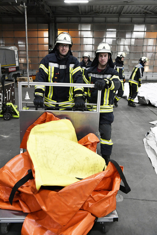 Ruhig und fokussiert verfolgen die Freiwilligen ihre Aufgaben. Die hüfthohen Liegen ins vordere Sichtungszelt, das medizinische Equipment in das Behandlungszelt für Schwerstverletzte. Dazu Lampen und Heizungen. Hinter den Zelten, wo im Unglücksfall Notarztfahrzeuge an- und abfahren, mehrere Warndreiecke. Unter realen Bedingungen dauert es zehn Minuten, bis sich ein Quader von je 1,2 Metern Kantenlänge in ein Lazarettzelt verwandelt. Pro Stunde lassen sich darin bis zu 50 Menschen versorgen. "Normalerweise benötigen wir 30 Minuten, bis alles steht", sagt Lüttich. Heute dürfen sich die Feuerwehrleute mehr Zeit lassen.
