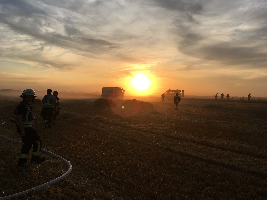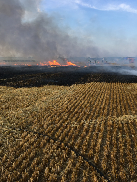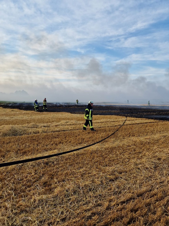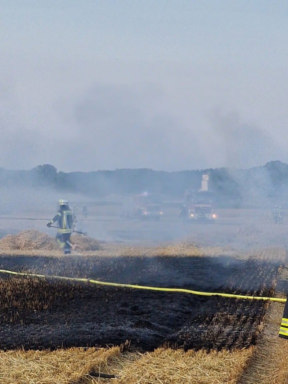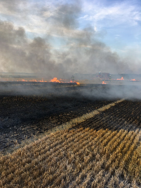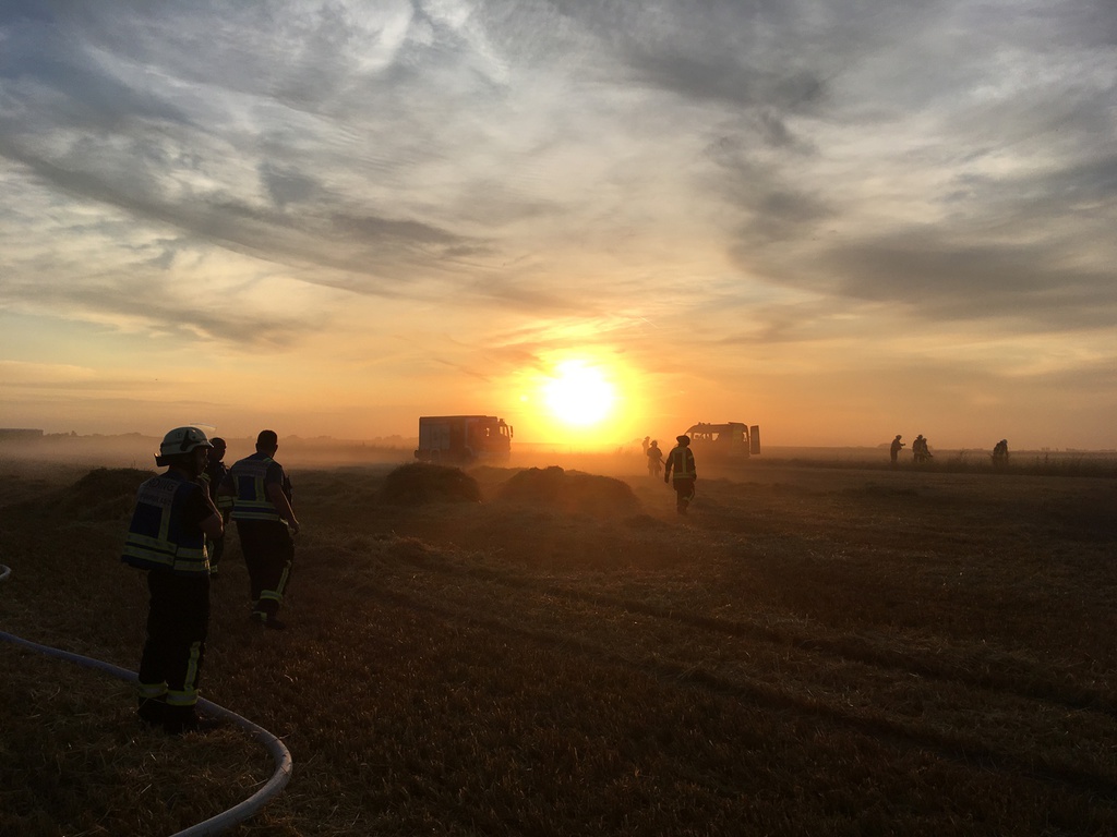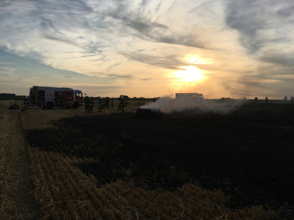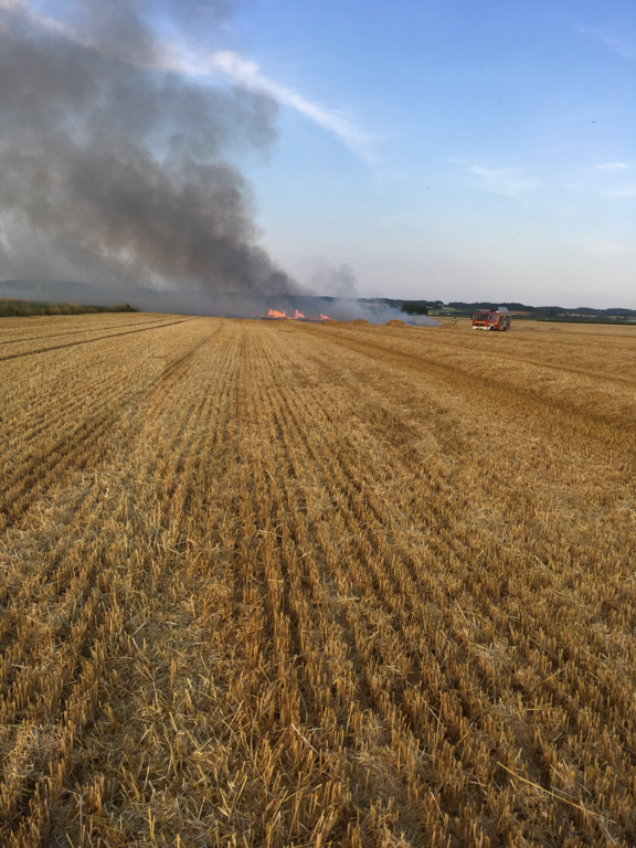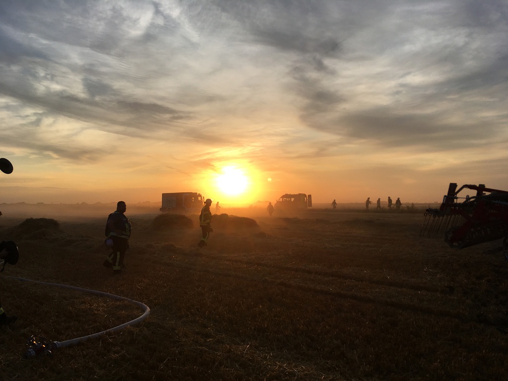 | Lagebeschreibung: | Wir wurden auf einen Gerstenfeldbrand alarmiert. Beim Pressen des Strohs war eine Ballenpresse in Brand geraten und hatte das abgeerntete Feld in Brand gesetzt. Die Ballenpresse war zu einer Hofstelle gefahren worden. Somit hatten wir zwei Einsatzstellen abzuarbeiten. Nach dem Ablöschen des Feldbrands wurde die Brandfläche gegrubbert. Die Ballenpresse wurde geöffnet und die darin noch enthaltenen Ballen entfernt und abgelöscht. | |