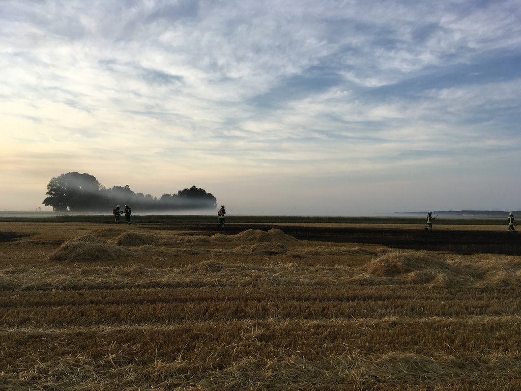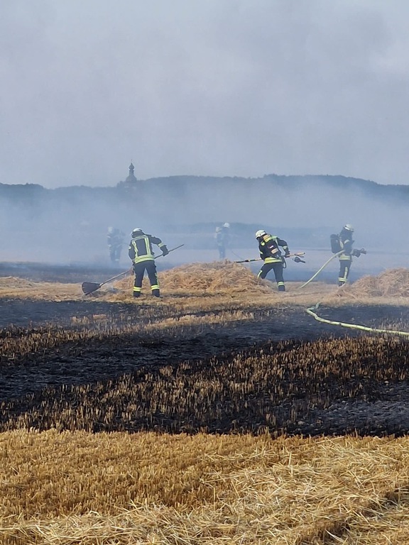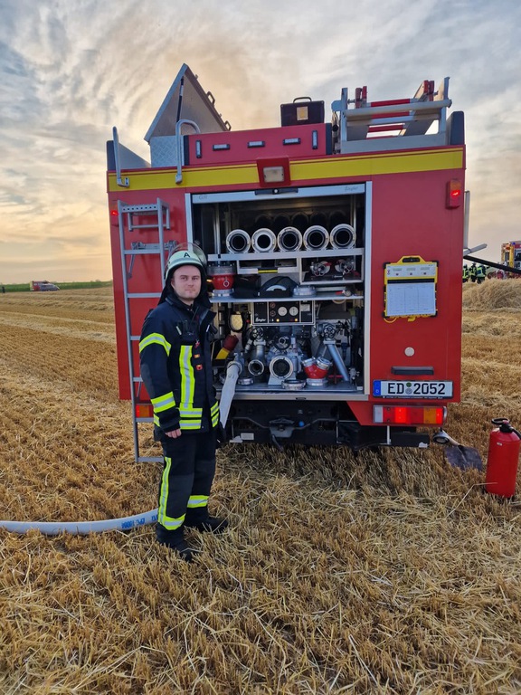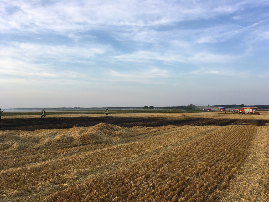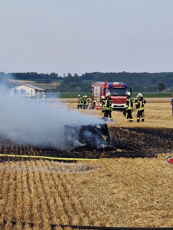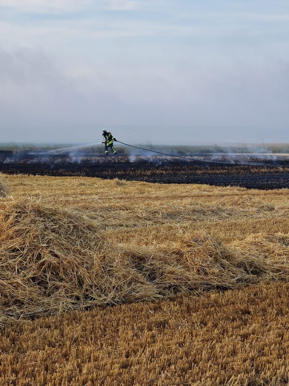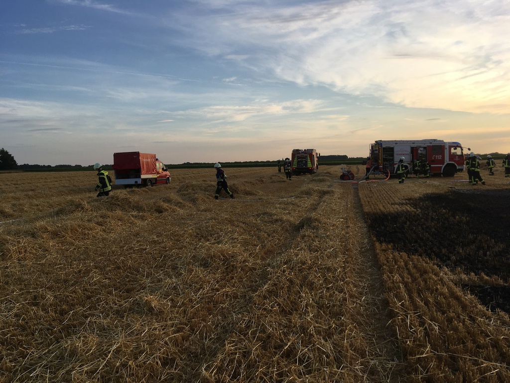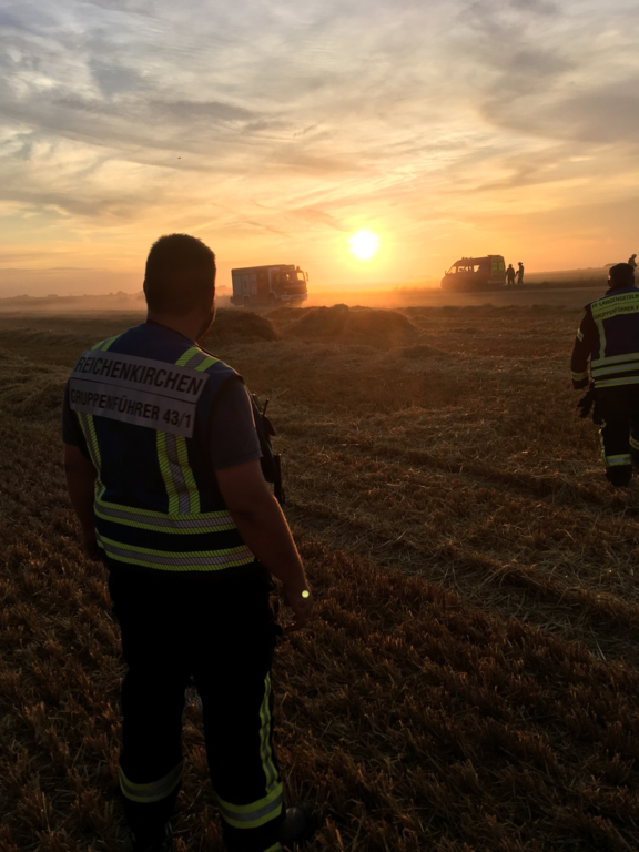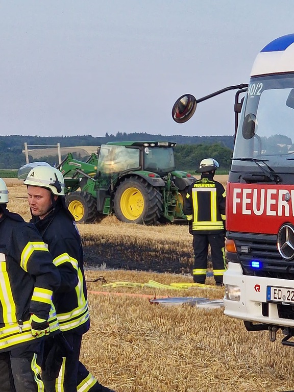 | Lagebeschreibung: | Wir wurden auf einen Gerstenfeldbrand alarmiert. Beim Pressen des Strohs war eine Ballenpresse in Brand geraten und hatte das abgeerntete Feld in Brand gesetzt. Die Ballenpresse war zu einer Hofstelle gefahren worden. Somit hatten wir zwei Einsatzstellen abzuarbeiten. Nach dem Ablöschen des Feldbrands wurde die Brandfläche gegrubbert. Die Ballenpresse wurde geöffnet und die darin noch enthaltenen Ballen entfernt und abgelöscht. | |