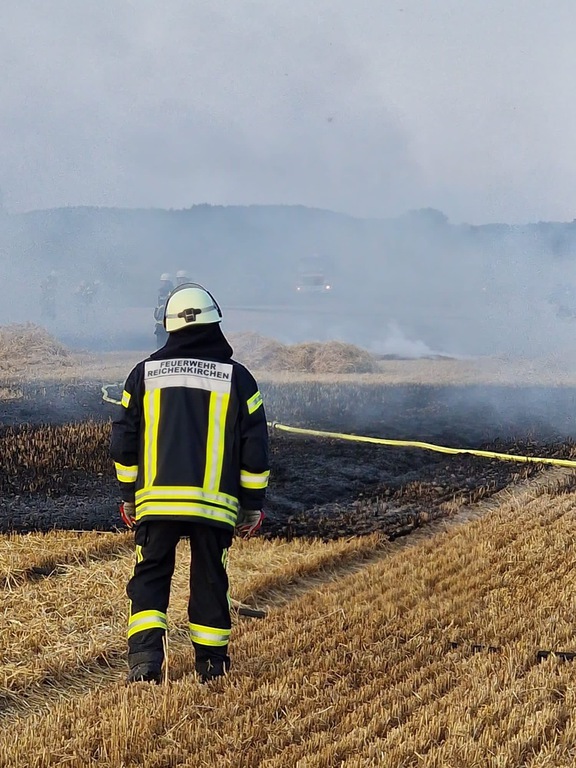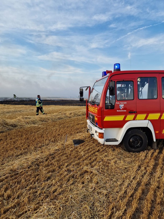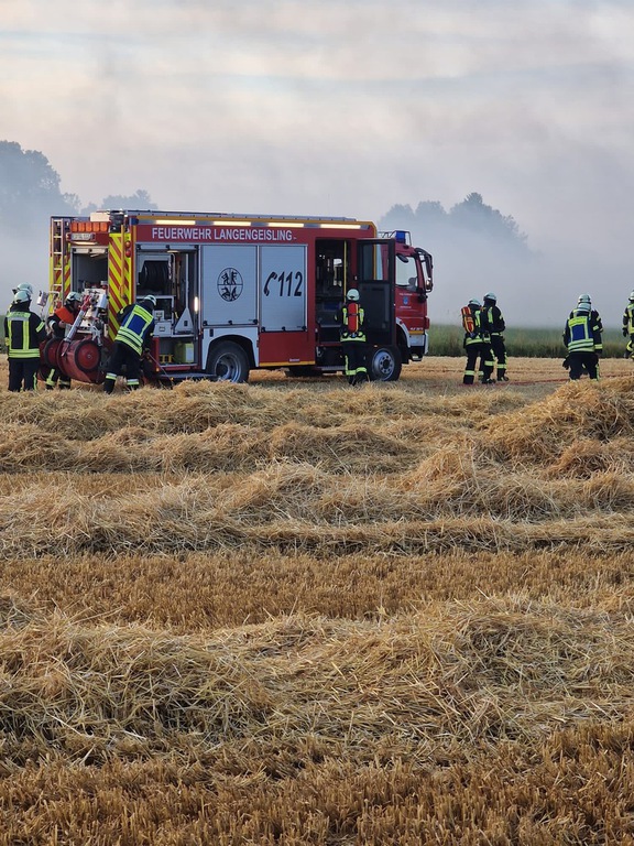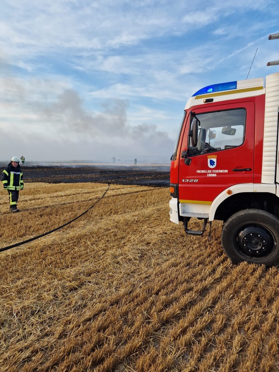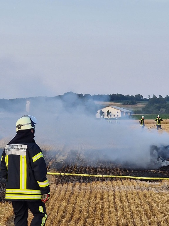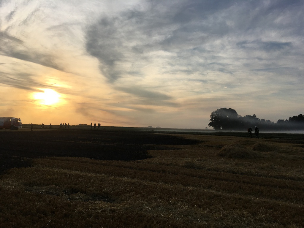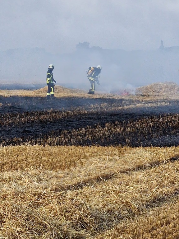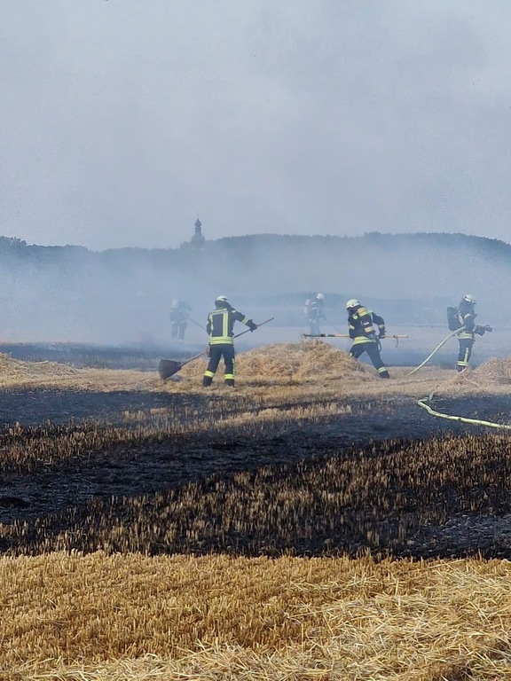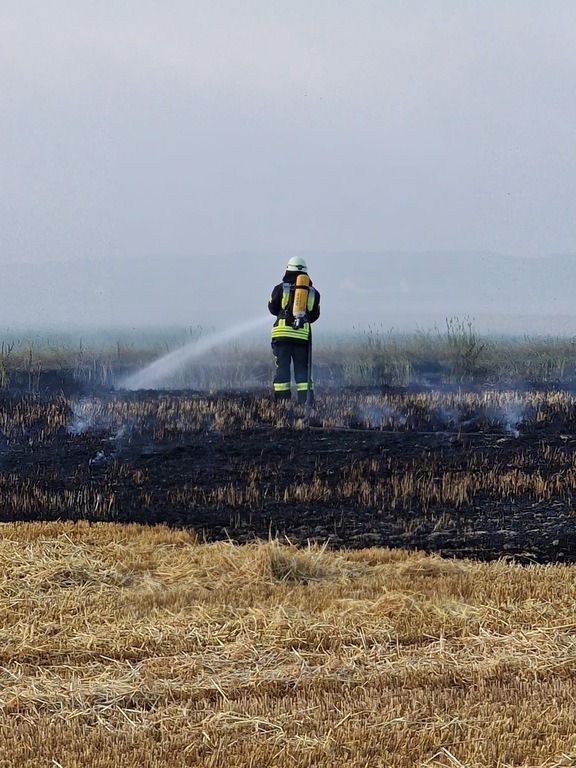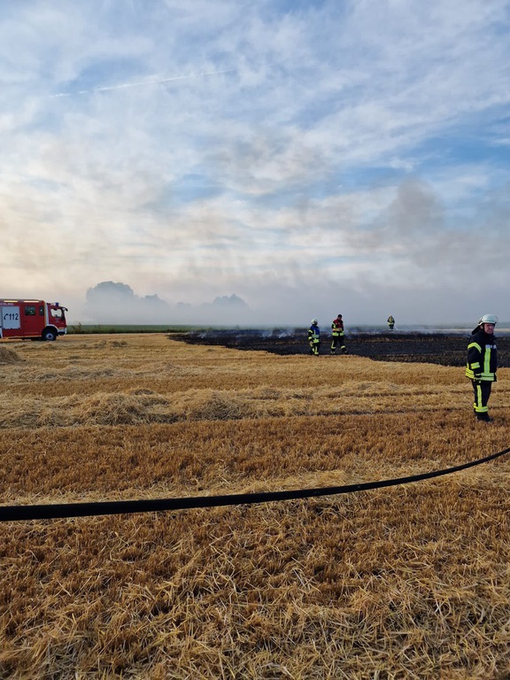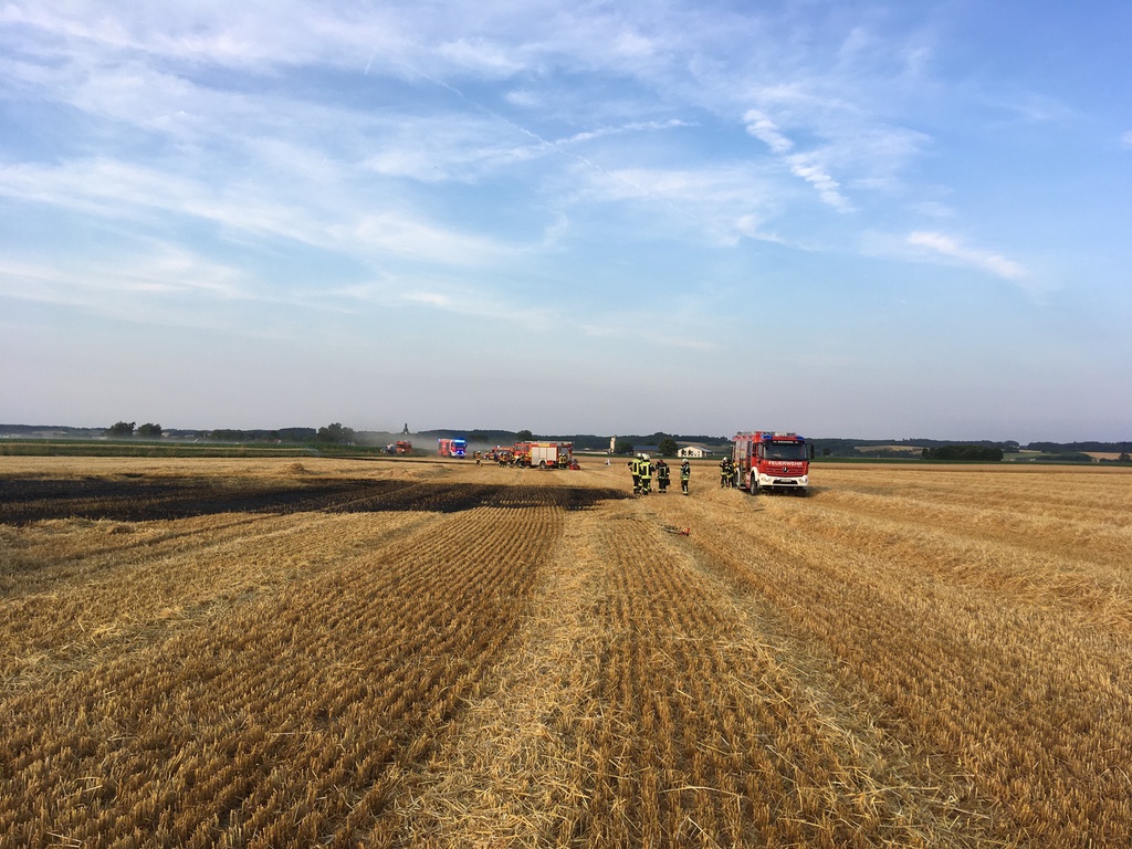 | Lagebeschreibung: | Wir wurden auf einen Gerstenfeldbrand alarmiert. Beim Pressen des Strohs war eine Ballenpresse in Brand geraten und hatte das abgeerntete Feld in Brand gesetzt. Die Ballenpresse war zu einer Hofstelle gefahren worden. Somit hatten wir zwei Einsatzstellen abzuarbeiten. Nach dem Ablöschen des Feldbrands wurde die Brandfläche gegrubbert. Die Ballenpresse wurde geöffnet und die darin noch enthaltenen Ballen entfernt und abgelöscht. | |